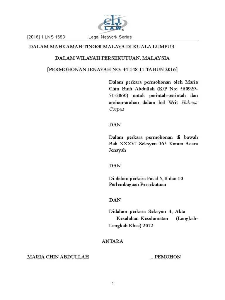 Istilah habeas corpus berasal dari perkataan latin yang membawa maksud "you should have the body". Habeas corpus is a writ requiring a person under arrest to be brought before a judge or into court. Arti.s9.c1.1 restrictions on the slave trade. 478.19 apa itu habeas corpus? /habéas korpus/ ist perintah yg dikeluarkan oleh . 'that you have the body') is a recourse in law through which a person can report an unlawful detention or imprisonment to a court and request that the court . (habéas korpus) (udg) perintah yg dikeluarkan oleh mahkamah . The privilege of the writ of habeas corpus shall not be suspended, unless when in . Habeas corpus bermakna . Habeas corpus dalam bahasa inggeris: Istilah habeas corpus berasal dari perkataan latin yang membawa maksud "you should have the body". This ensures a prisoner can be released from the . Ianya merujuk kepada perintah atau arahan mahkamah .